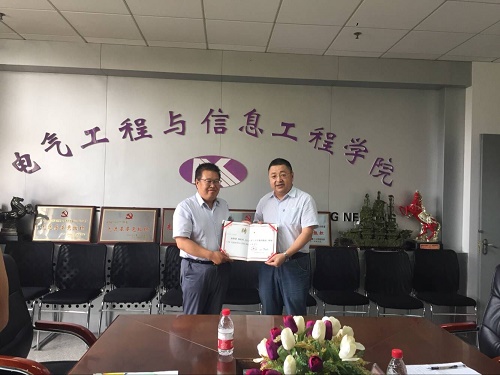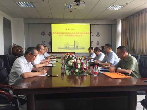 7月5日下午,应我院邀请,国网甘肃省电力公司电力科学研究院景乾明院长、李树林副院长,科技部主任杨勇等一行来学院交流,我院杨新华书记、陈伟副院长、包广清副院长等人参加了座谈会。陈伟副院长主持了座谈会,陈伟副院长对景乾明院长一行做了隆重介绍并致欢迎辞。杨新华书记为景乾明院长颁发了兼职教授聘书。